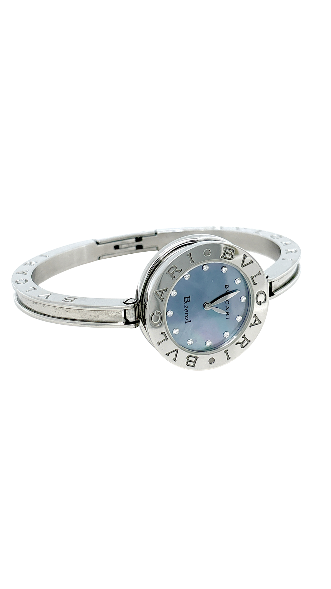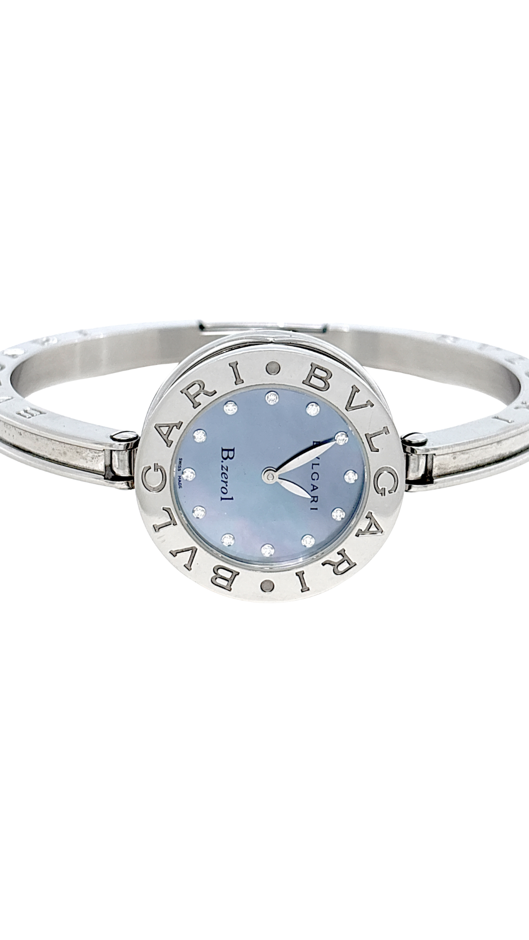 Orologio marca Bvlgari, modello B-Zero Lady in acciaio. Movimento: Quarzo. Diamanti originali all’interno del quadrante di base color celeste.